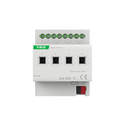 四路帶電流檢測開關(guān)執(zhí)行器主要應(yīng)用在樓宇控制系統(tǒng)中,通過 EIB/ KNX 總線和 其他總線設(shè)備一起安裝成為系統(tǒng),主要用于控制開關(guān)負(fù)載。開關(guān)執(zhí)行器可以開關(guān) 4 路到 12 路獨立電氣交流負(fù)載或三相負(fù)載。每個開關(guān)執(zhí)行器輸出的最大負(fù)載電 流為 16 A,且都可手動開啟或關(guān)閉,其開關(guān)狀態(tài)都可看得見。