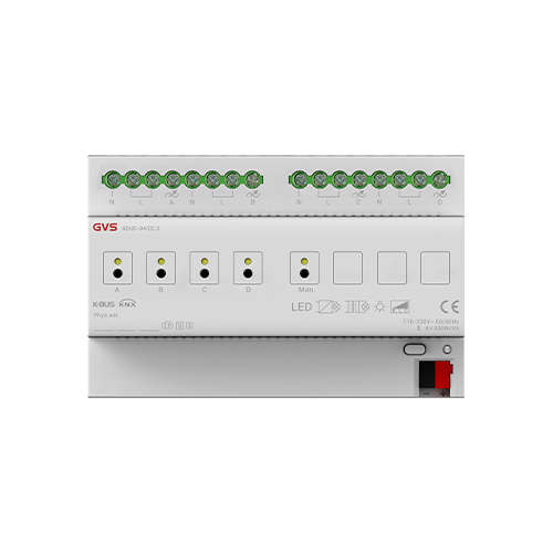 1/2/4 路通用調(diào)光執(zhí)行器(以下簡稱調(diào)光器)根據(jù)產(chǎn)品有 1/2/4 路輸出,可連接一些具有可調(diào)光性能的燈光設(shè)備(如白熾燈、鹵素?zé)簟⒐?jié)能燈、LED 燈等),通過總線可以對這些燈光設(shè)備進(jìn)行調(diào)光、場景預(yù)設(shè)、開關(guān)燈等操作,同時(shí)也支持 KNX 安全協(xié)議。采用導(dǎo)軌式安裝的調(diào)光器設(shè)計(jì)安裝在 35 毫米 DIN 導(dǎo)軌上的模數(shù)化設(shè)備,輸出端采用螺絲接線柱實(shí)現(xiàn)電氣連接。調(diào)光器的總線連接都是直接通過 KNX 接線端子連接,系統(tǒng)供電除總線外不需要額外的電源電壓。