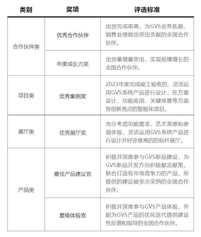 本次頒獎(jiǎng)活動(dòng)共設(shè)立4大類6大獎(jiǎng)項(xiàng),GVS的全國合作伙伴均有機(jī)會(huì)參與所有獎(jiǎng)項(xiàng)的競(jìng)逐。