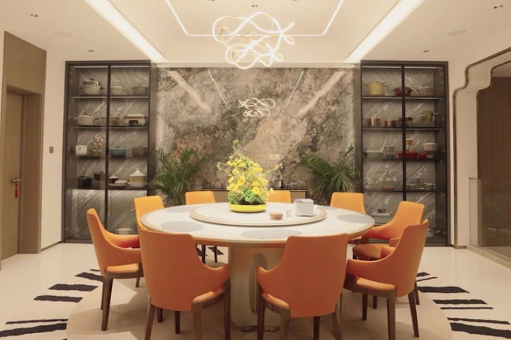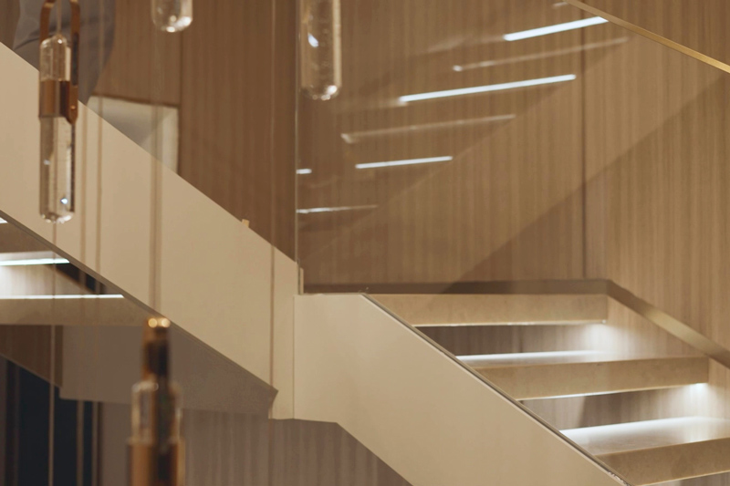 跟隨生活場景隨心調(diào)配燈光,中餐模式、西餐模式、會客模式、品茗模式......即使是同一個空間,也能營造出不同的氛圍感貫徹一層負(fù)一層空間的踏步燈帶旋轉(zhuǎn)梯,燈隨人亮,靈動智能,上下樓都有了別樣的趣味