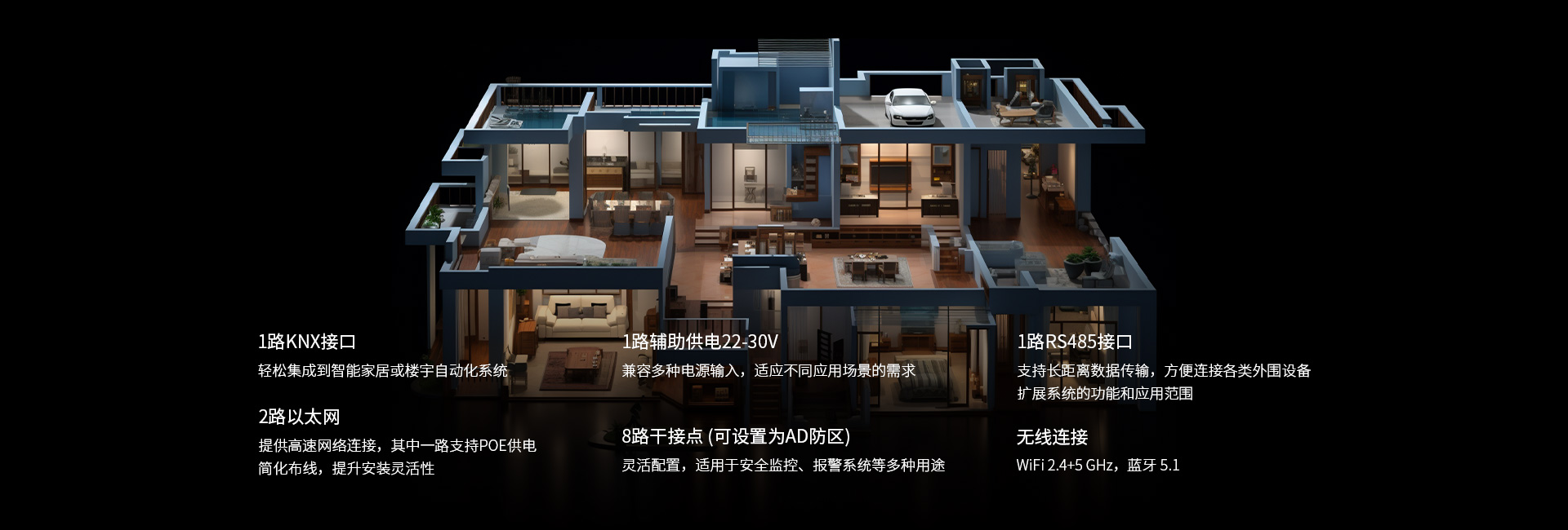 含1路KNX接口、2路以太網(wǎng)、1路輔助供電22-30V、8路干接點(diǎn)(可設(shè)置為AD防區(qū))、1路RS485接口,并支持WiFi 2.4+5 GHz,以及藍(lán)牙 5.1無線連接。