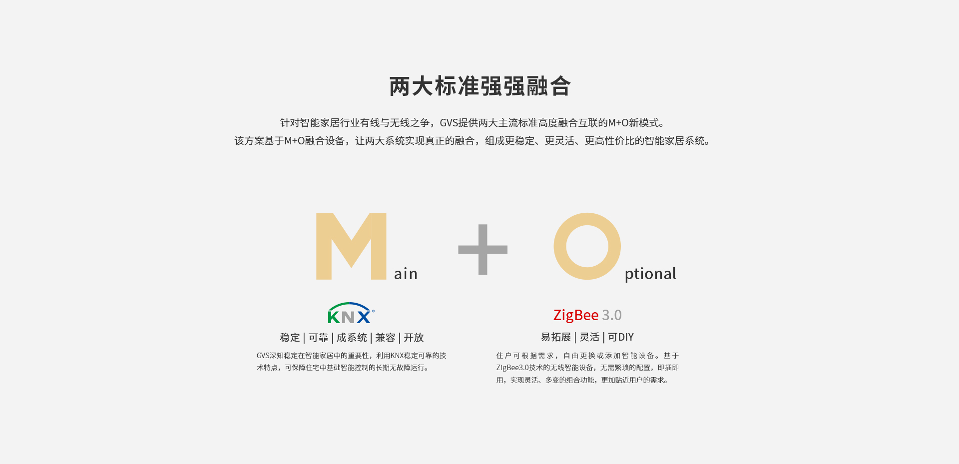 針對智能家居行業(yè)有線與無線之爭,GVS提供兩大主流標準高度融合互聯(lián)的M+O新模式。該方案基于M+O融合設備,讓兩大系統(tǒng)實現(xiàn)真正的融合,組成更穩(wěn)定、更靈活、更高性價比的智能家居系統(tǒng)。
