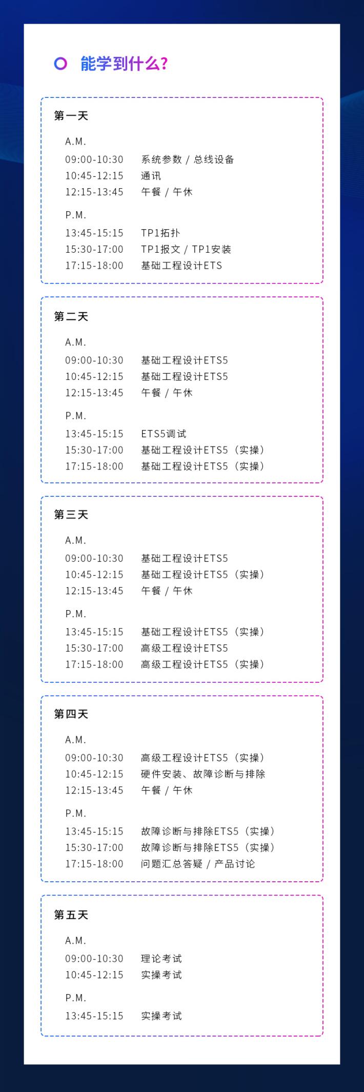 理論+實(shí)操,為期5天的培訓(xùn)內(nèi)容詳實(shí)豐富,必定讓你對(duì)KNX應(yīng)用技術(shù)有一個(gè)全面而深入的了解,你甚至或許能以專業(yè)客觀的角度對(duì)KNX設(shè)計(jì)方案的整體質(zhì)量作出評(píng)價(jià)。