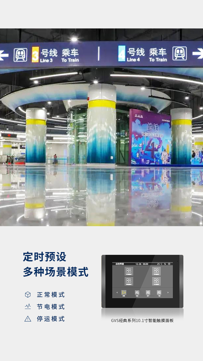 3號(hào)線每一個(gè)站點(diǎn)中控室里,都安裝了一個(gè)GVS經(jīng)典系列10.1寸智能觸摸面板,在觸摸屏上,工作人員可以很清晰的看到站廳、站臺(tái)、入口以及站外等照明狀態(tài),直接滑動(dòng)按鈕就可以實(shí)現(xiàn)一個(gè)站點(diǎn)的燈光智能控制。